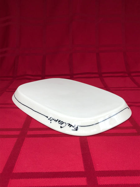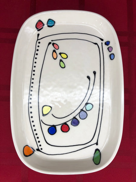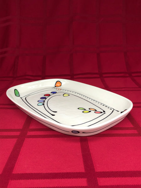 A rectangular porcelain tray decorated with colorful dots and perfect for dinner, serving or just to hold things!