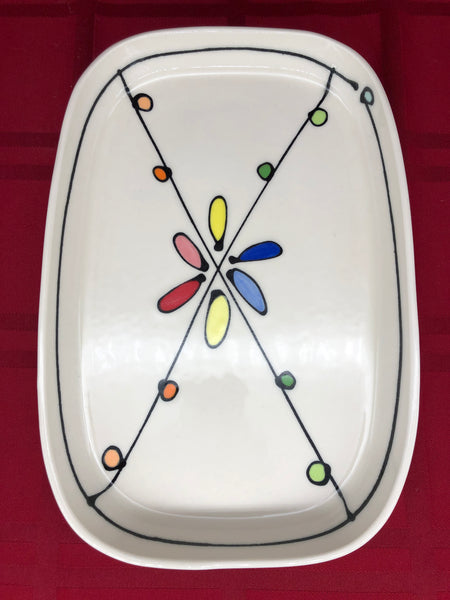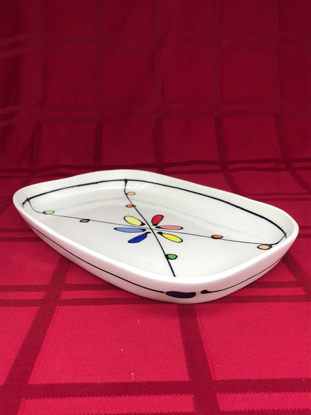 A rectangular porcelain tray decorated with colorful dots and perfect for dinner, serving or just to hold things!