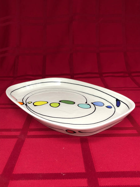 A rectangular porcelain tray decorated with colorful dots and perfect for dinner, serving or just to hold things!