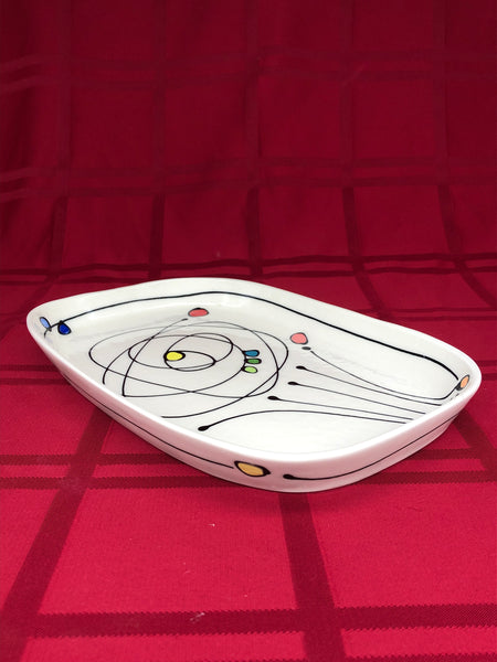 A rectangular porcelain tray decorated with colorful dots and perfect for dinner, serving or just to hold things!