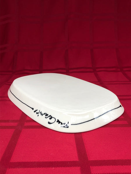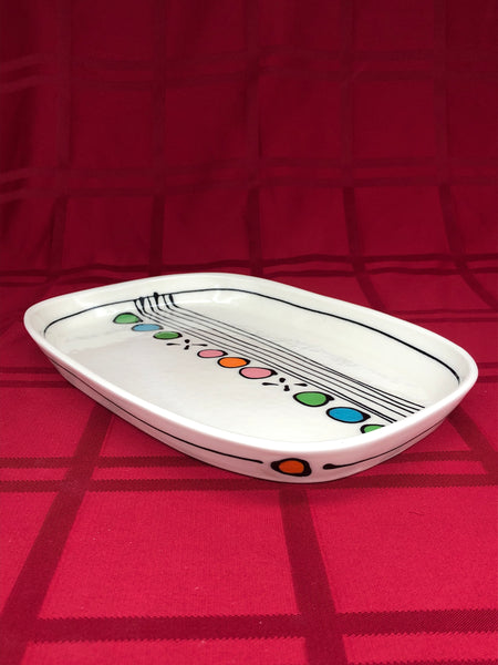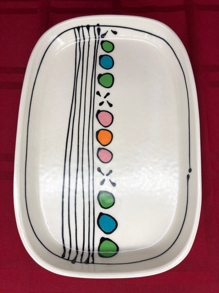 A rectangular porcelain tray decorated with colorful dots and perfect for dinner, serving or just to hold things!