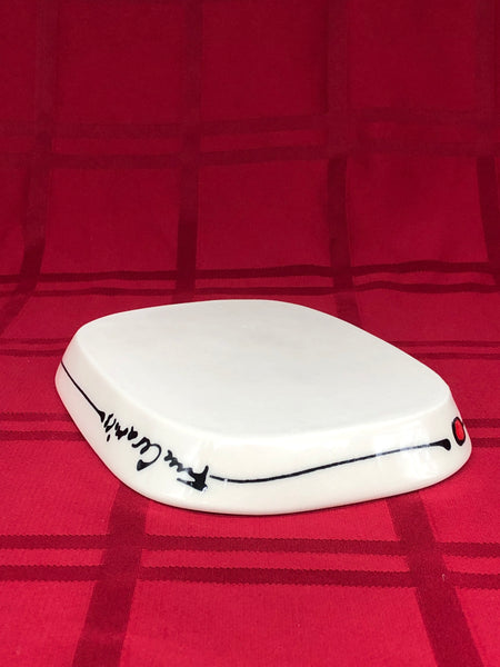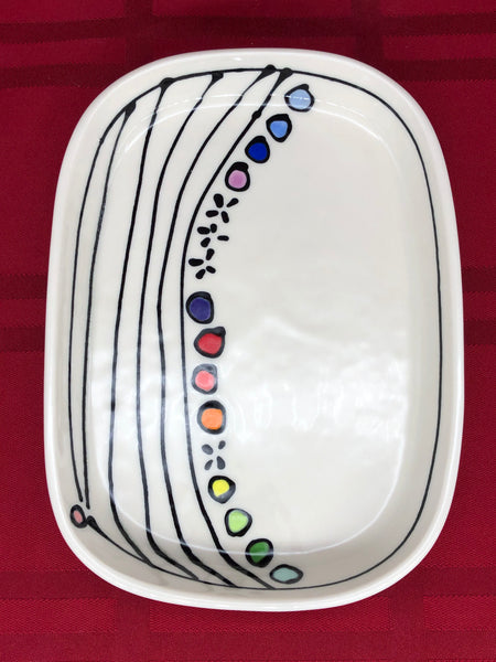 A small rectangular porcelain tray decorated with colorful dots and perfect for a sandwich, lunch or quick snack!