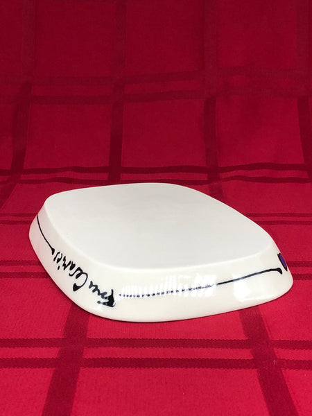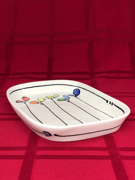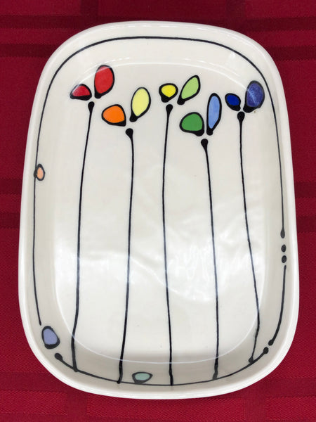 A small rectangular porcelain tray decorated with colorful dots and perfect for a sandwich, lunch or quick snack!