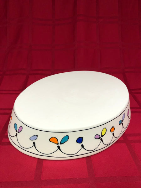 This large, whimsical tray commands the center of attention at any table with its bold dancing black lines and colorful dots! It is well suited for serving the main course of a meal or appetizers at a party. A gorgeous piece at a larger size to accommodate many culinary functions!