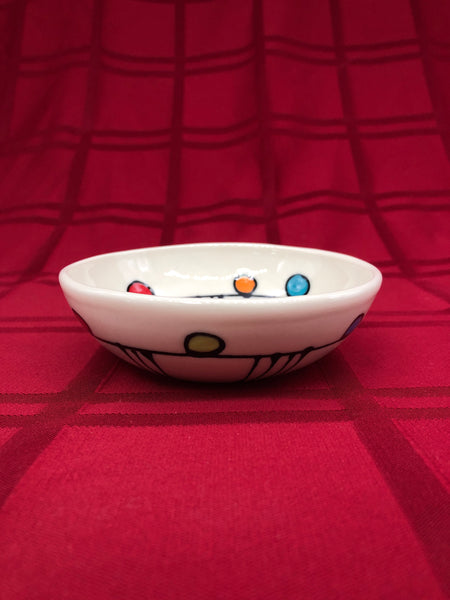 A small porcelain bowl decorated with an array of whimsical colorful dots. This bowl is the perfect size for cooking or baking, holding sauces or spices, or a little snack, as it fits comfortably in your hands.